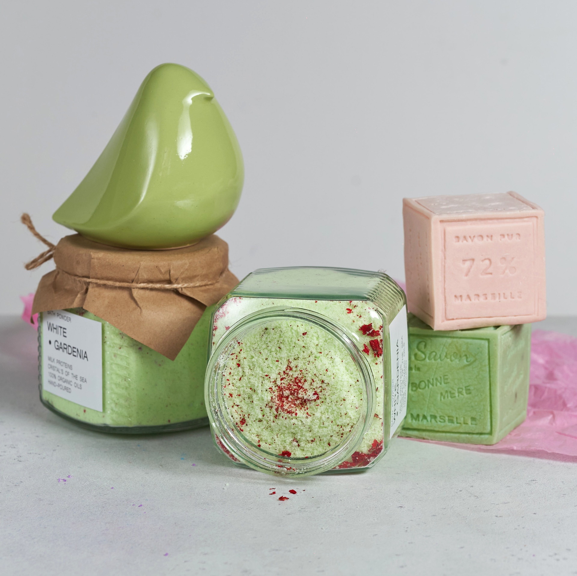 Набор из интерьерной керамической птички ручной работы, пудры для ванны «Белая гардения» и кубиков мыла «Кардамон» и «Розе» в тканевых мешочках.