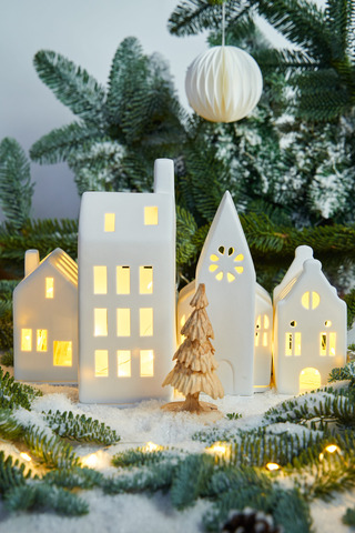 Церковь и домики из этой коллекции можно выстроить в небольшую заснеженную улочку с десятком светящихся окошек. Или большую!)