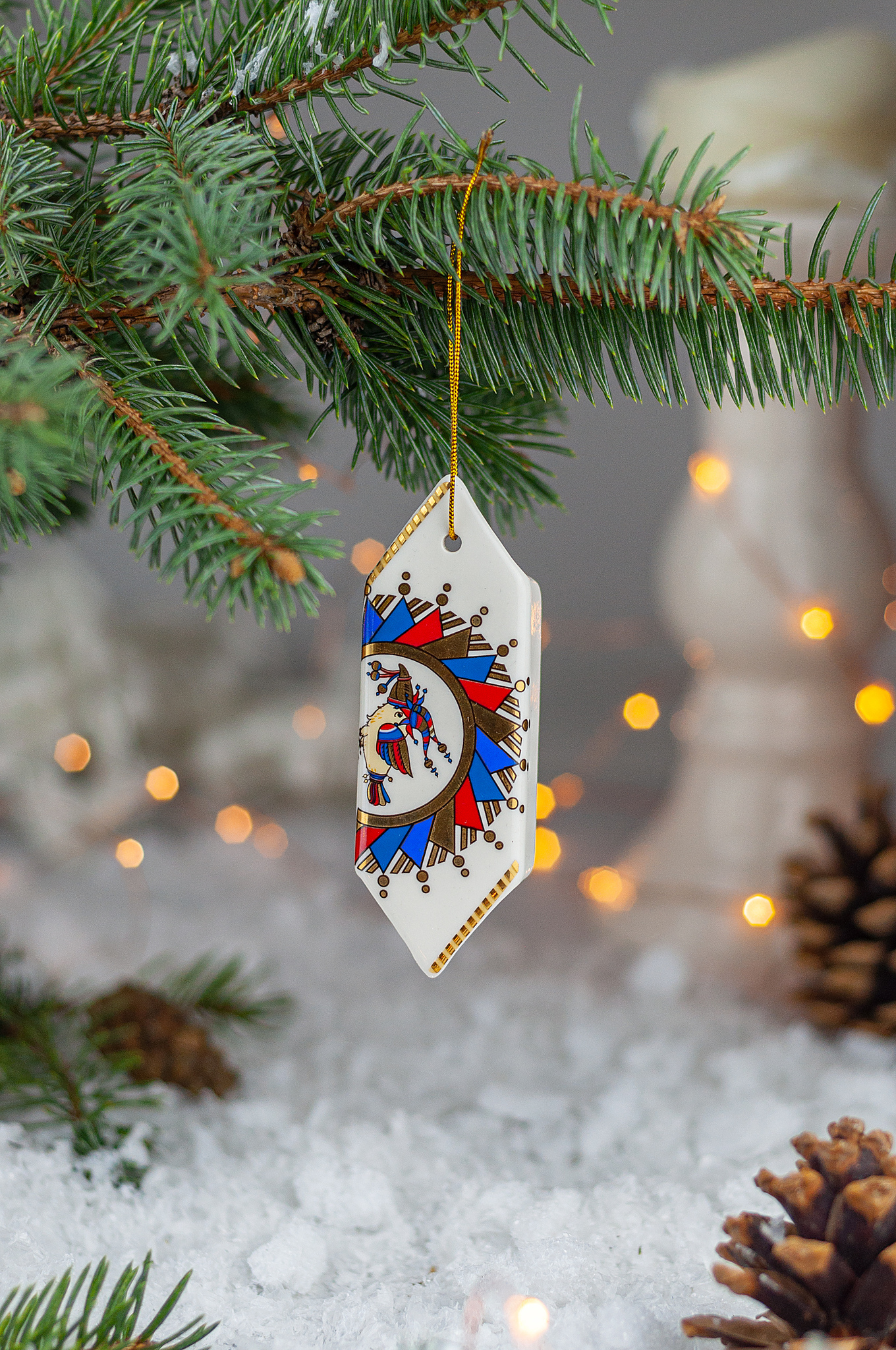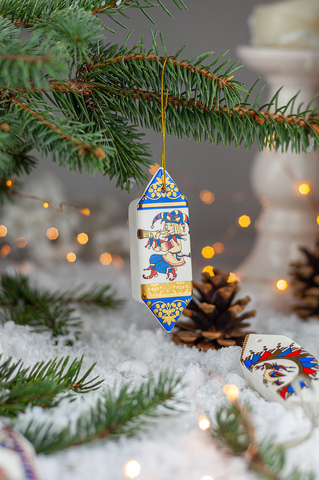 Игрушка из фарфора "Конфета Скоморохи" - елочное украшение ручной работы от российской студии керамики, мастера которой постарались объединить лучшие черты русского керамического искусства, возродить народные традиции, положив в основу достаточно популярные приемы ручной росписи ярко-синим кобальтом по белому полю керамики.