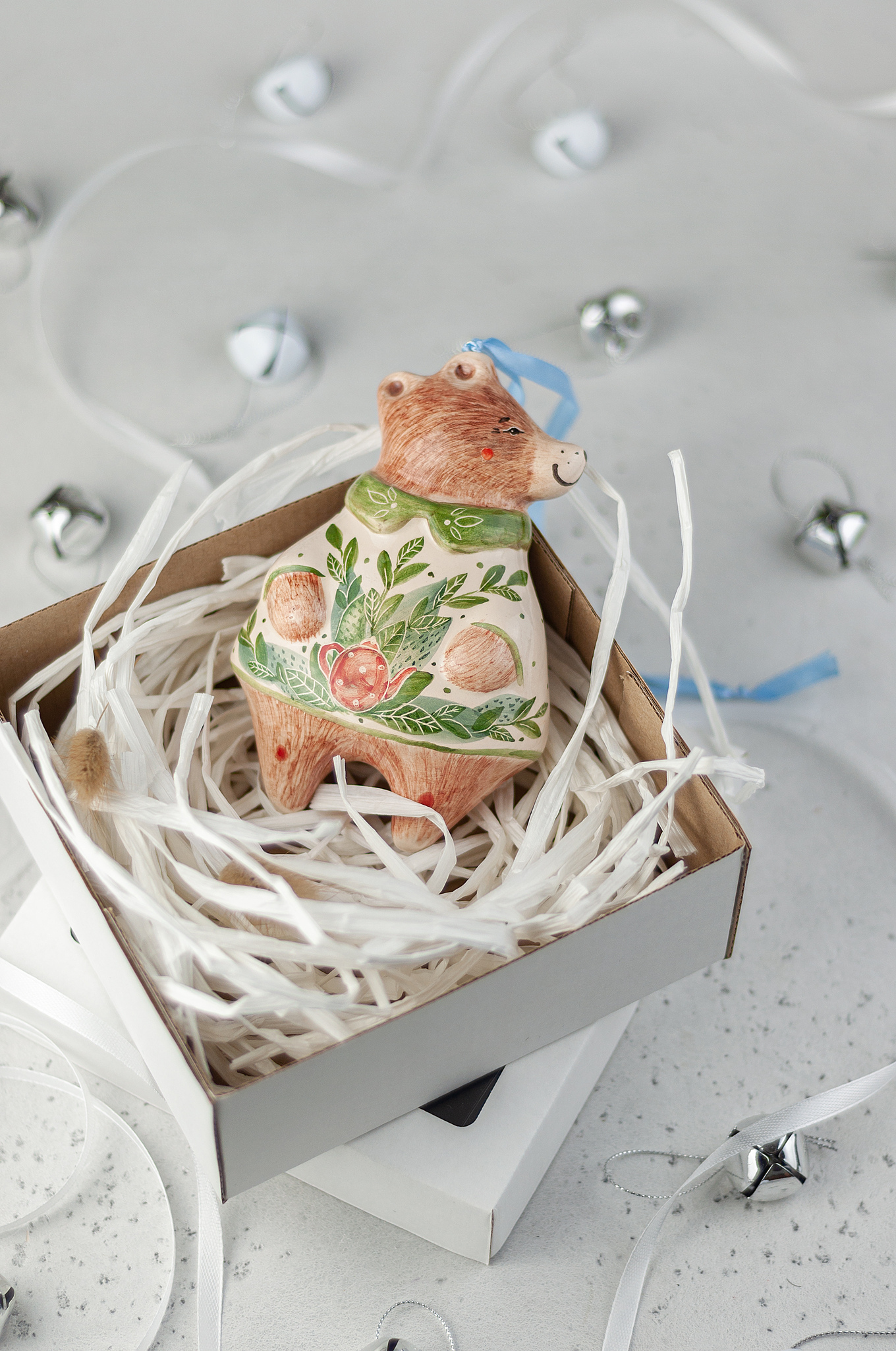Расписана руками мастеров Байкальской студии керамики и покрыта прозрачной глазурью. Самый добрый и теплый подарок на Новый год и Рождество Христово. Очень легкая и крепкая игрушка, благодаря особому способу обжига на высоких температурах.