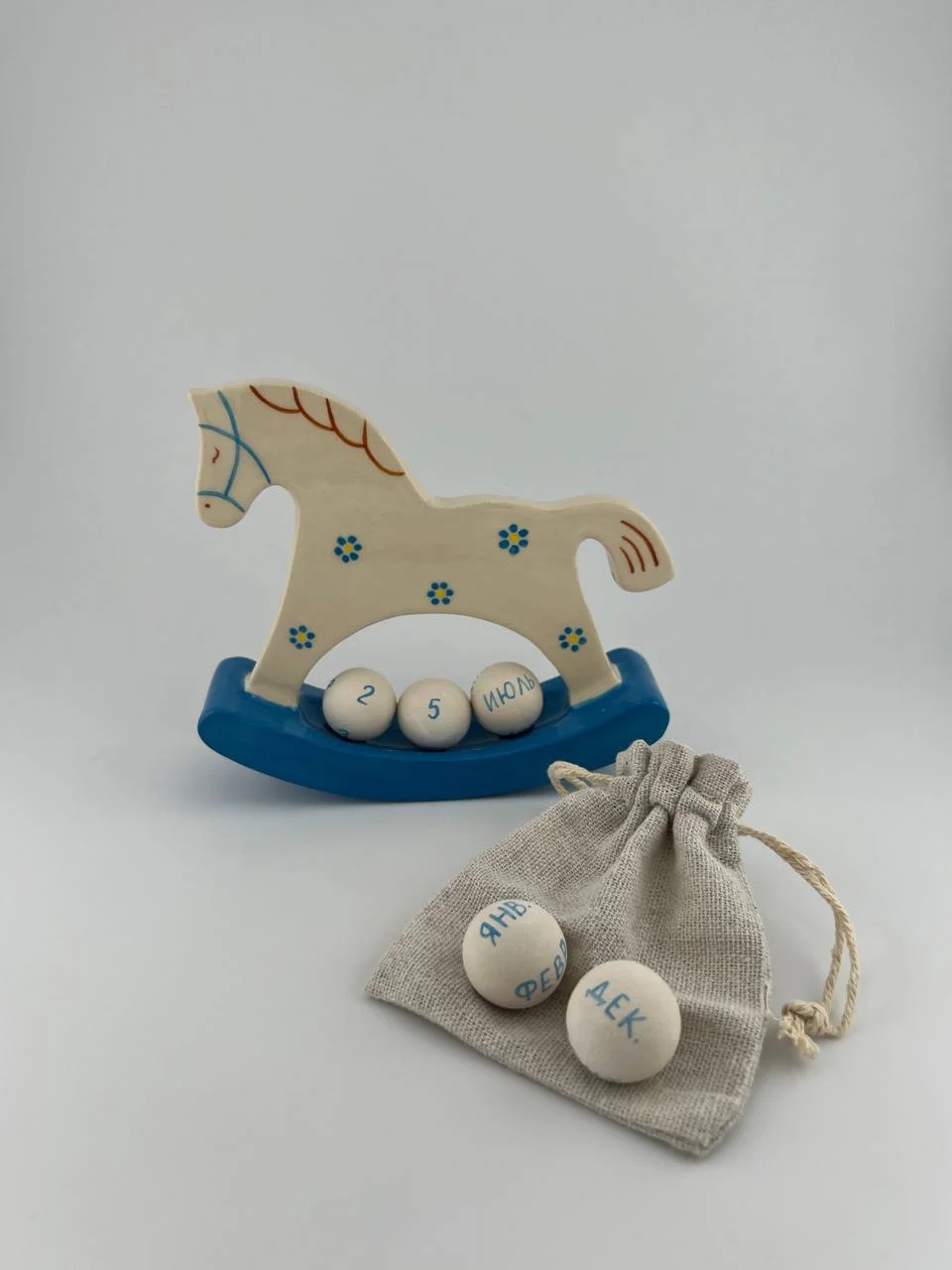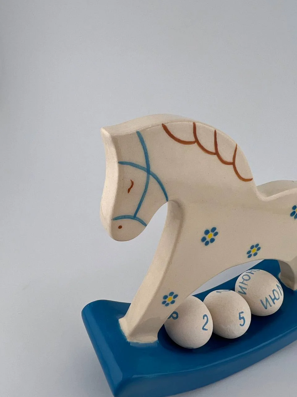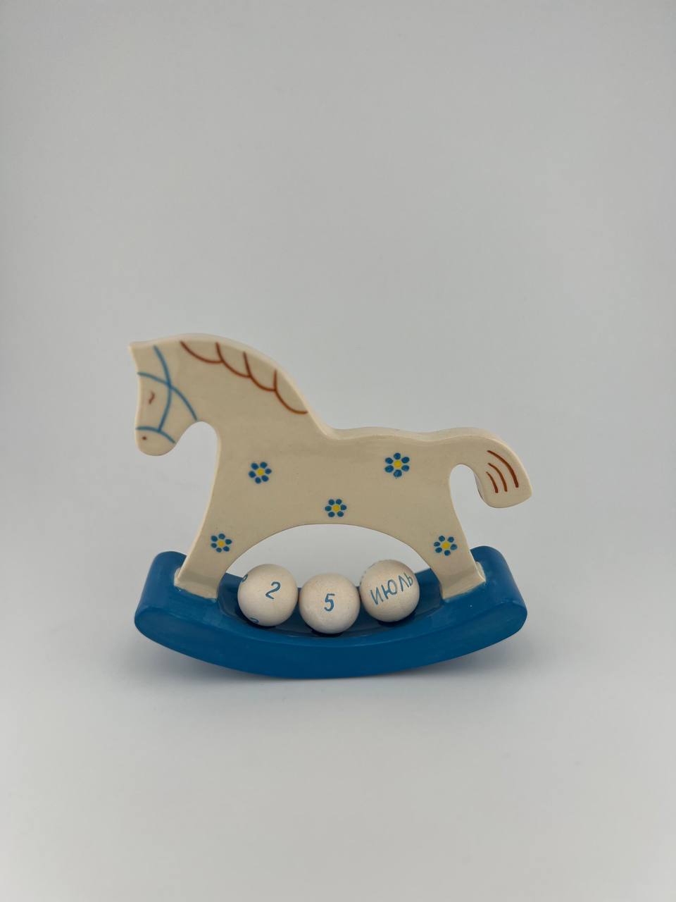 Настольный вечный календарь - это лошадка в авторской росписи c  шариками, на которых написаны названия двенадцати месяцев и числа, которые складываются в актуальные даты календаря.