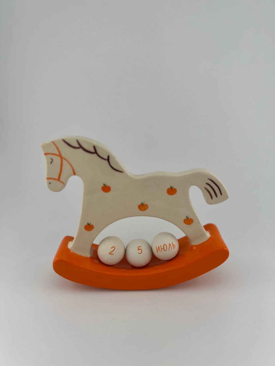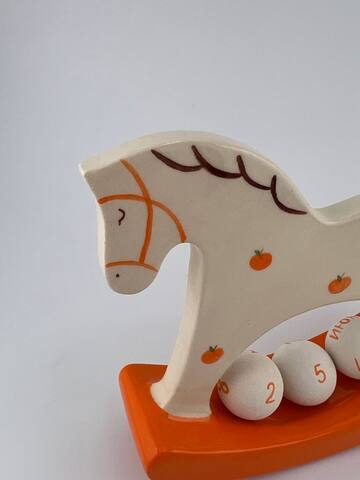 Настольный вечный календарь - это лошадка в авторской росписи c шариками, на которых написаны названия двенадцати месяцев и числа, которые складываются в актуальные даты календаря.
